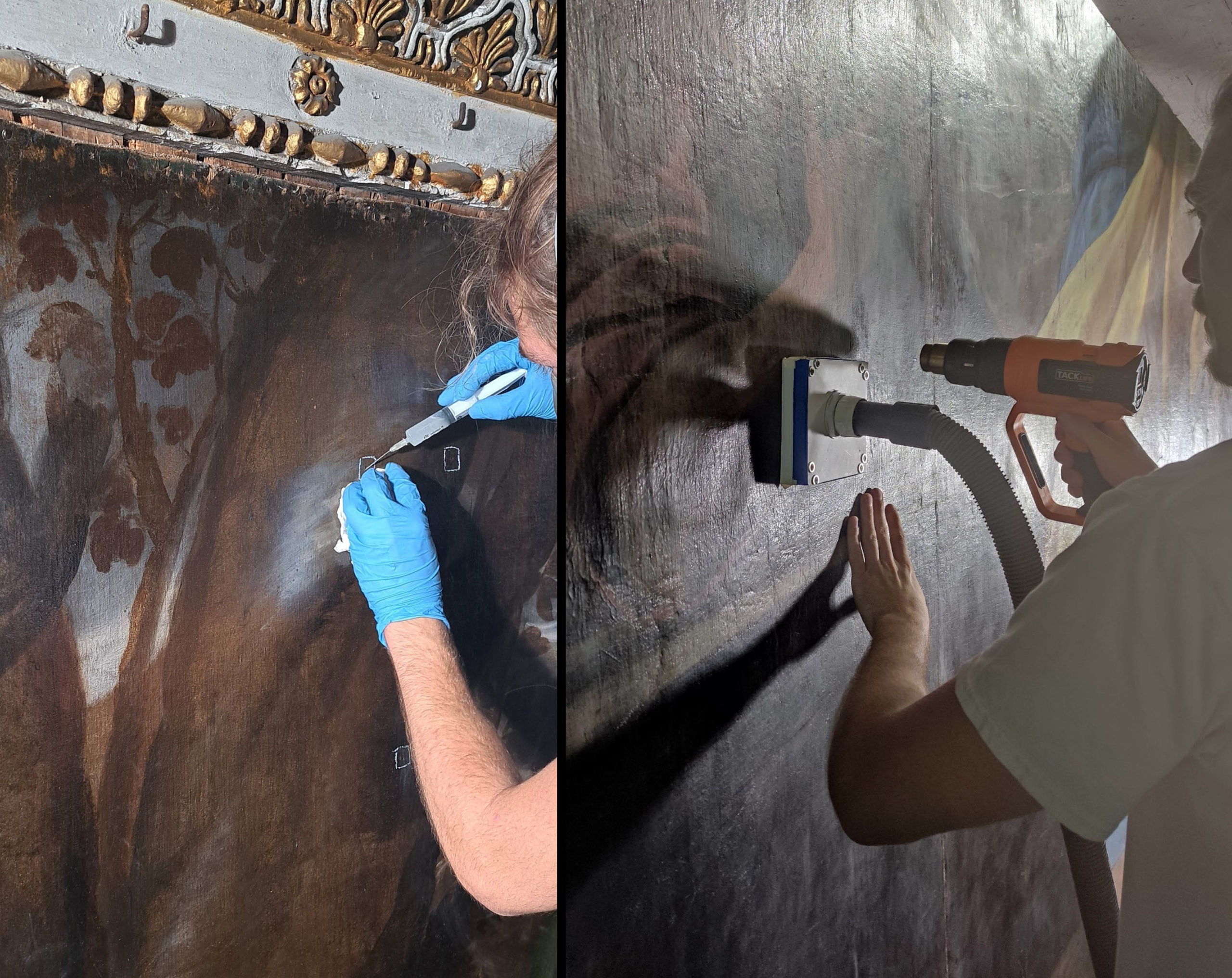 Riaperto il sipario sulle potenti e sfolgoranti cromie originali, sono riemersi i danni provocati non solo dalle numerosissime perdite di colore ma anche da significative abrasioni e colature pregresse che, sempre in stretto dialogo con la Direzione lavori, sono state progressivamente risarcite pittoricamente riconferendo unità di lettura al racconto dell’artista.
