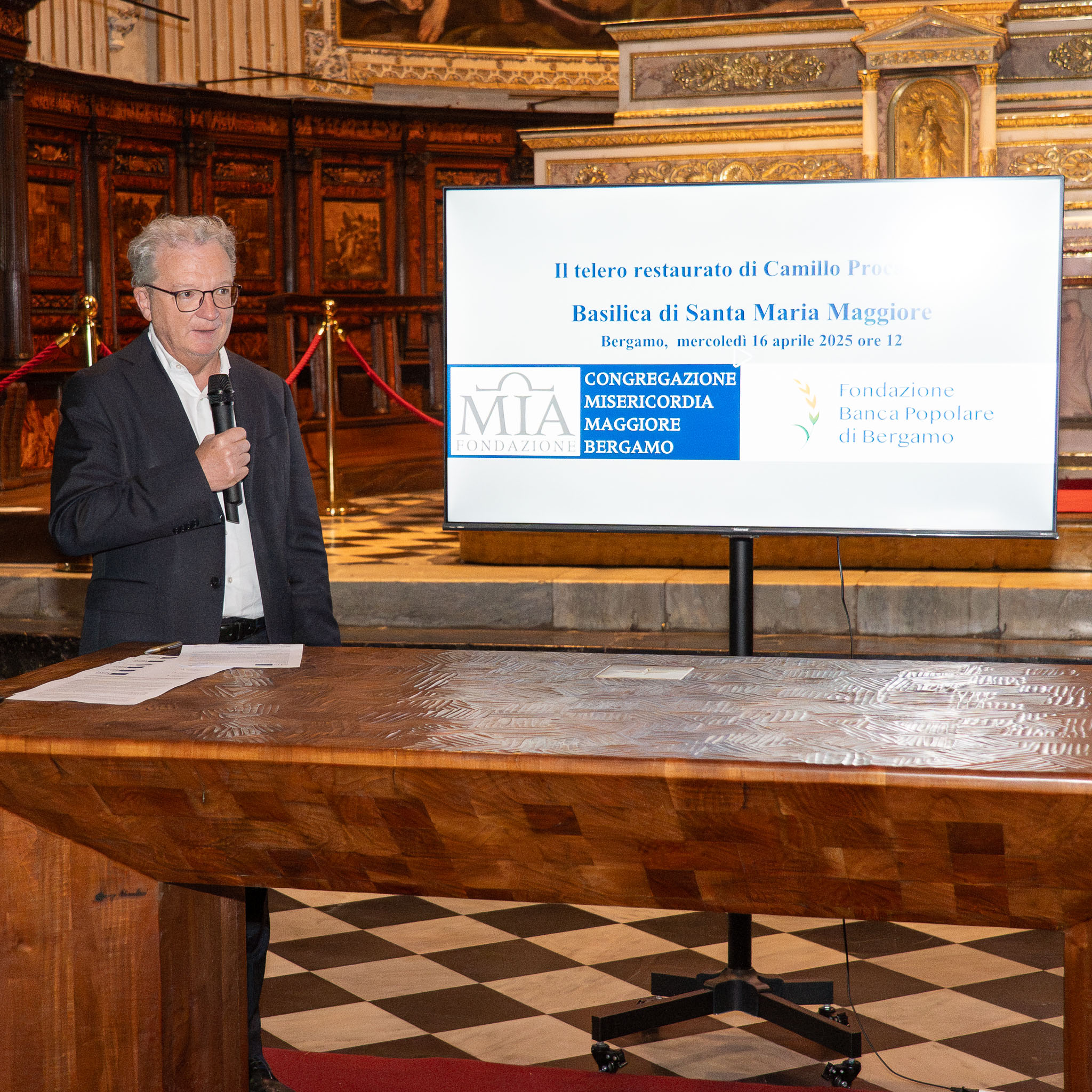 Armando Santus presidente Fondazione Banca Popolare di Bergamo: “Resta alta l’attenzione della Fondazione Banca Popolare di Bergamo, insieme a Intesa Sanpaolo, per la Basilica di Santa Maria Maggiore, autentico scrigno d’arte nel cuore di Città Alta. Il restauro del grande dipinto di Camillo Procaccini non rappresenta solo un intervento dal valore artistico in sé, volto a restituire alla tela la luminosità originaria delle sue pitture, ma si inserisce in un più ampio progetto di valorizzazione dello spazio absidale della chiesa, che ha già visto il recente restauro del Coro. Si tratta di opere diverse, ma tra loro collegate, che permettono ai visitatori di approfondire sempre di più la conoscenza dell’arte e della storia della Basilica, e quindi della città di Bergamo”.